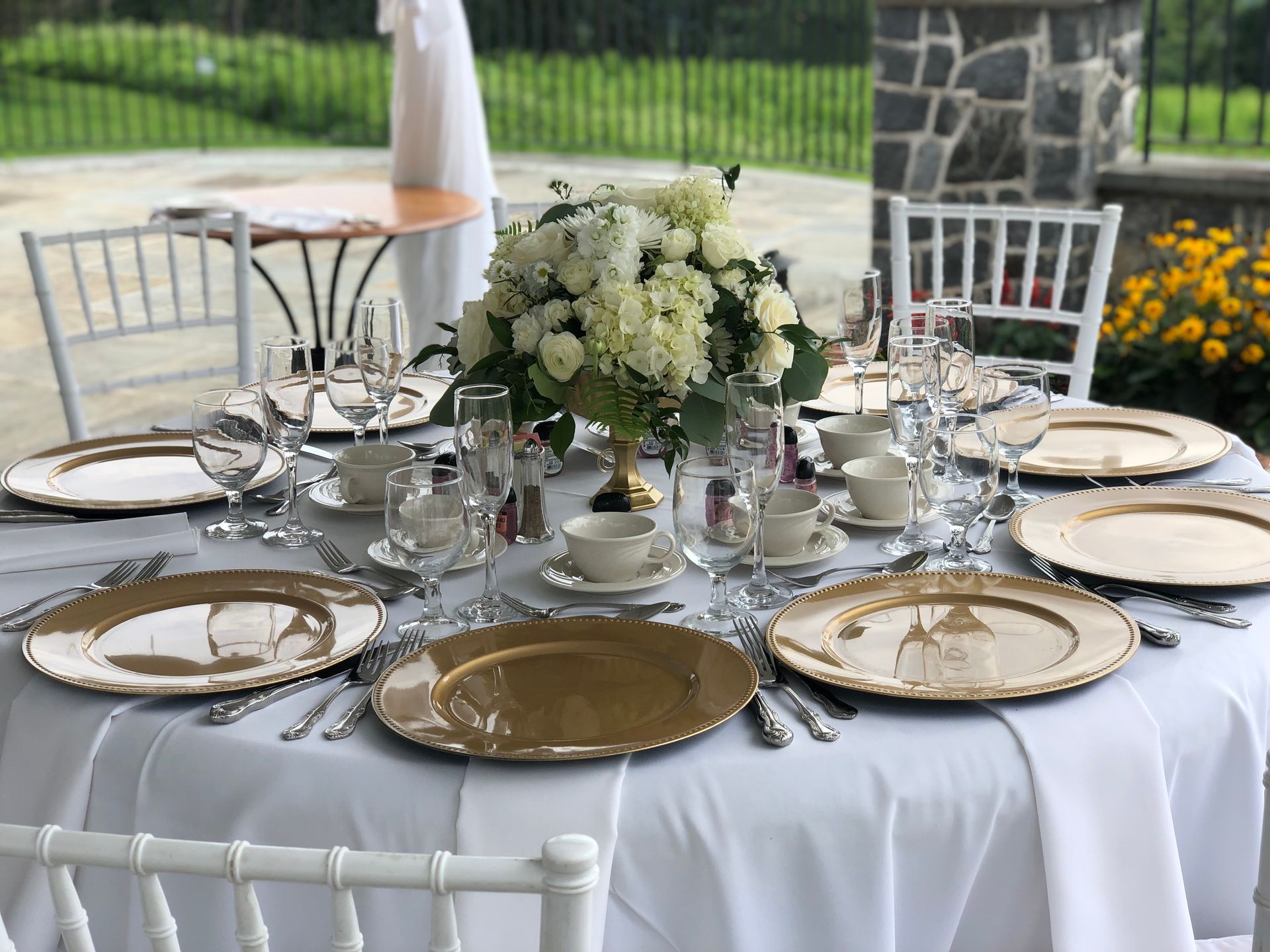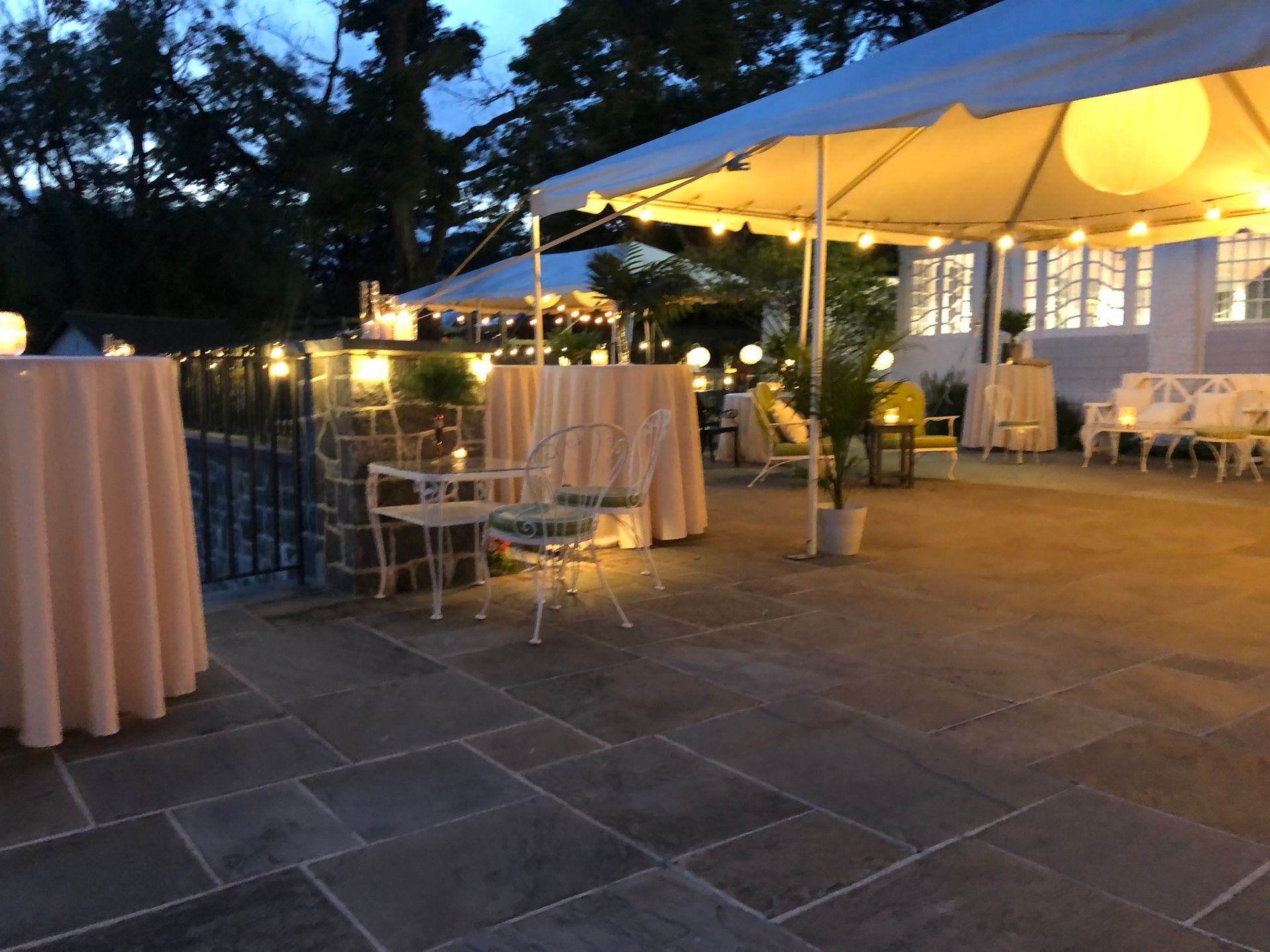 - Your rental includes the outdoor patio tents and bistro lights, (8) 60" round tables, (4) 8' rectangular tables, and (120) plastic folding chairs, polyester linens, flatware, glassware, and china.. All other rentals including tent sides, heaters, additional tables, additional chairs, specialty china, glassware, and flatware are not included and must be rented separately at an additional cost.